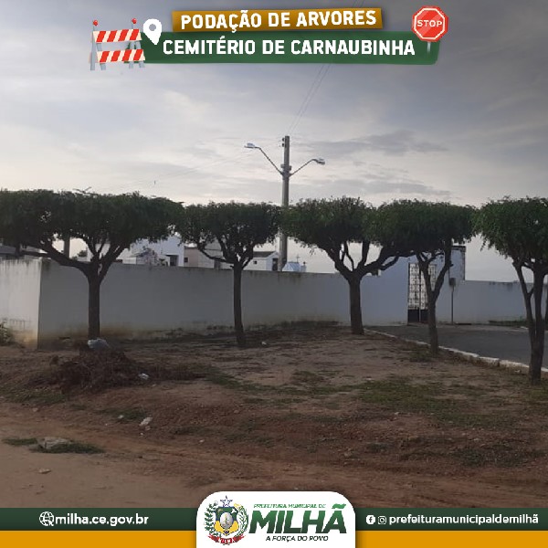 A Prefeitura de Milhã realiza limpeza e podação de arvores no Distrito de Carnaubinha. As ações se concentram na avenida principal e no cemitério. O serviço é importante por manter as ruas sempre limpas e as arvores cortadas sem atrapalhar a mobilidade.